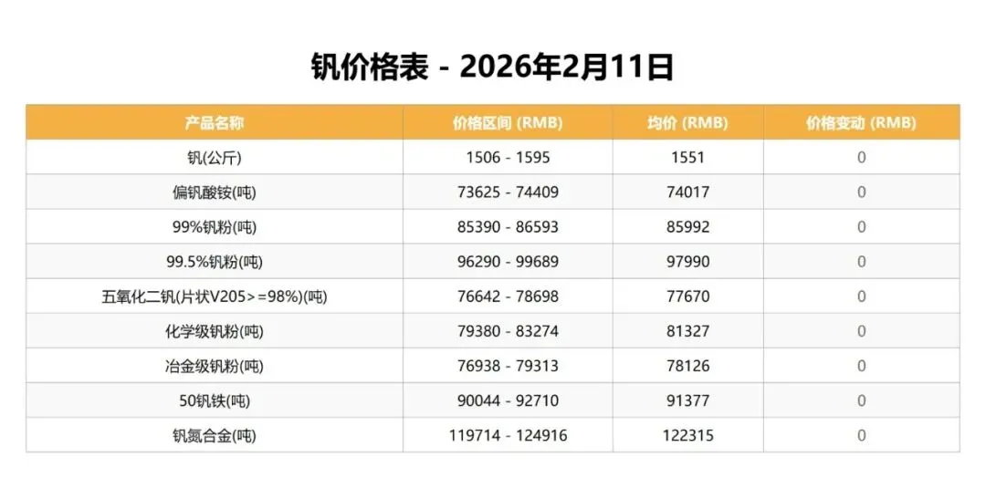 今日钛产品价格全面稳定,所有品类价格均未变动。钒产品市场同样表现平静,各品类价格均维持不变。钒荣网旨在汇聚钒钛产业链上下游企业,钒荣网将通过资讯浏览推送、“双碳”产业、在线交易推广、技术成果转让、产业金融、钒产业指数、行业标准会议会展、咨询服务数据报告等功能板块,为钒储能上下游企业提供商机对接、行业资讯、产业金融、市场拓展、名企研学、品牌宣传、数据服务、专属顾问等服务。
