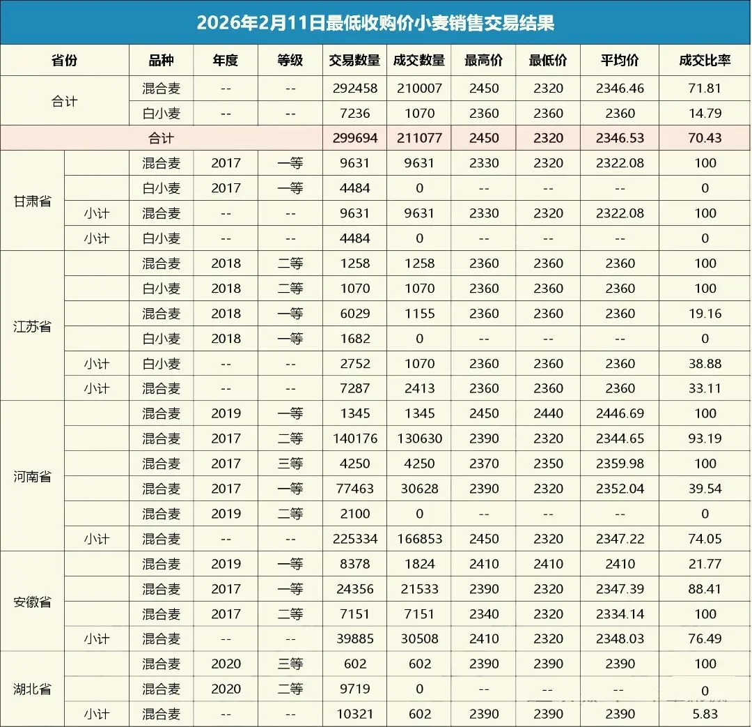 2月11日最低收购价小麦竞价销售计划投放299694吨,实际成交211077吨,成交率70.43%。