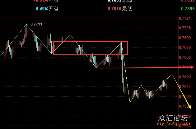 2017.7.5晚8:30左右,平掉0.03手,理由:该位置已出现背驰结构,下跌随时可以完成,且做单时目标即为0.758附近;剩余0.02手已设置保本止损,继续看空理由,日线一笔下未完成!如图3