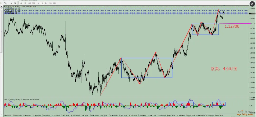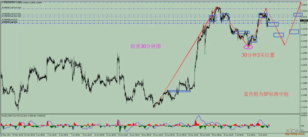 3、后期做单应对:若行情如期走出一个30F的线段上,并突破新高,且内部结构完整,欧美本次4小时级别的趋势上涨极大的概率要向下转折;若行情并未按预期走出新高,或者直接从1.14200附近开始下跌,那么就要耐心等待行情有效跌破1.12700后,反抽不破新高,再做2卖空单,有效跌破4小时中枢下沿(1.11100),且反抽不过该位置的时候,加仓做3卖的欧美空单,期待欧美走一个30分钟趋势下跌,目标位置1.1000附近;