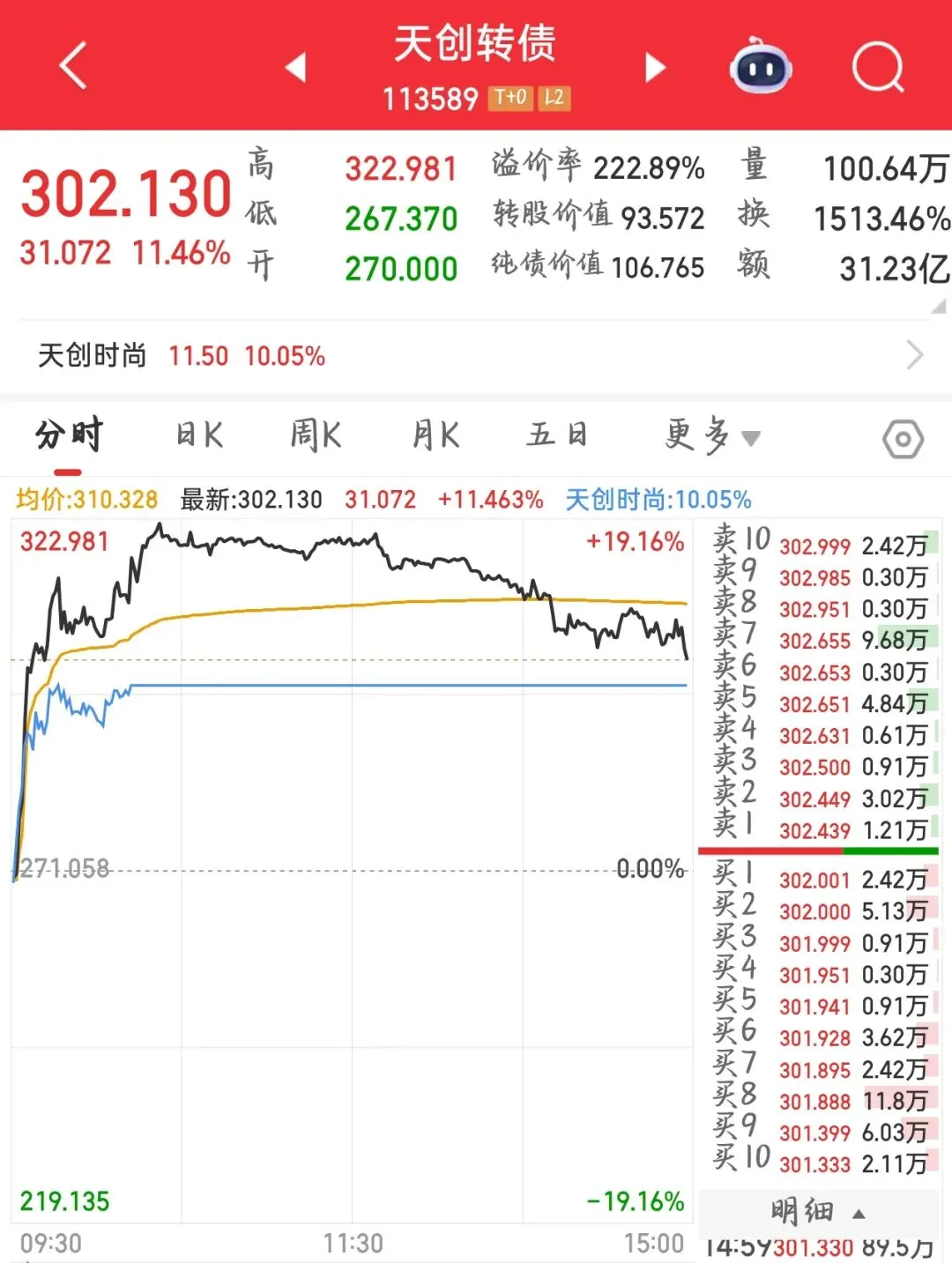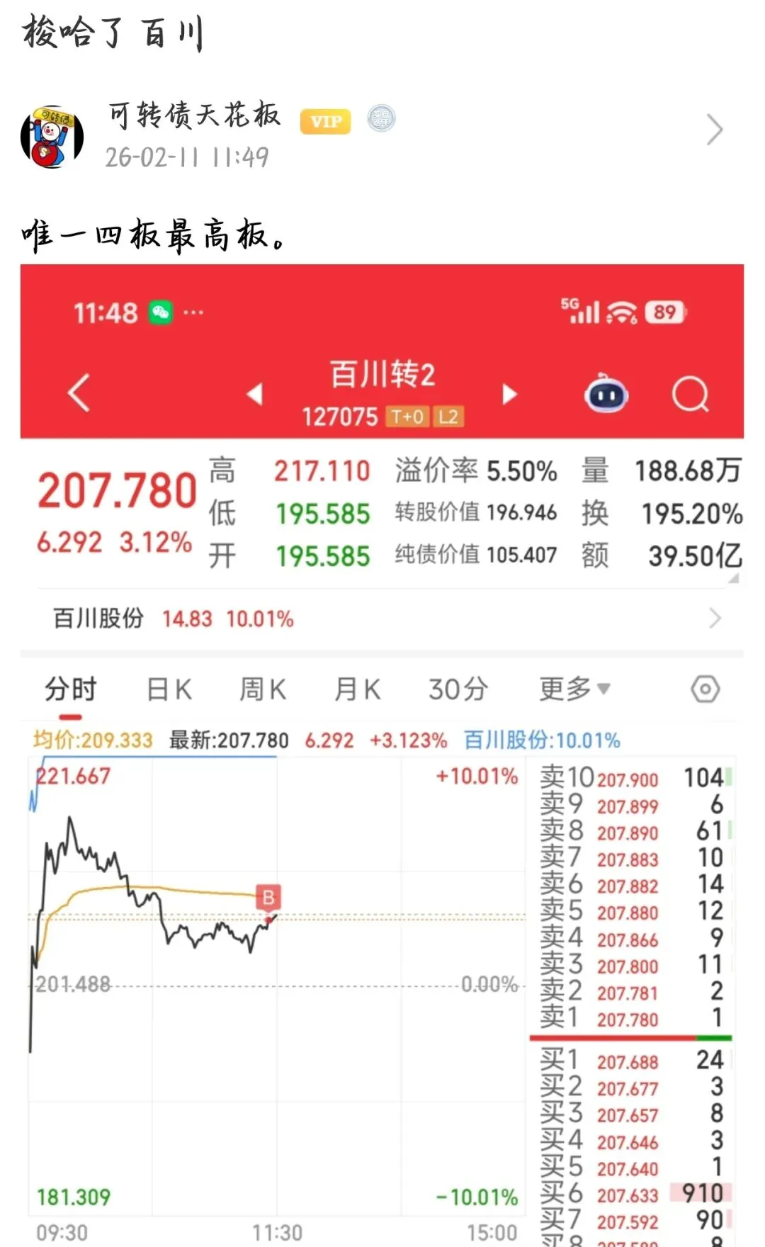 百川今天低开高走,正股也是4连板,成为目前市场上的最高连板股,同时也是目前市场连板最高标,说实话,目前整体市场混沌期+没有明确主线+缩量+百川本身已经来到了高位,不论明天正股还能不能进一步走出5连板,转债再进一步向上的空间都很小了。
