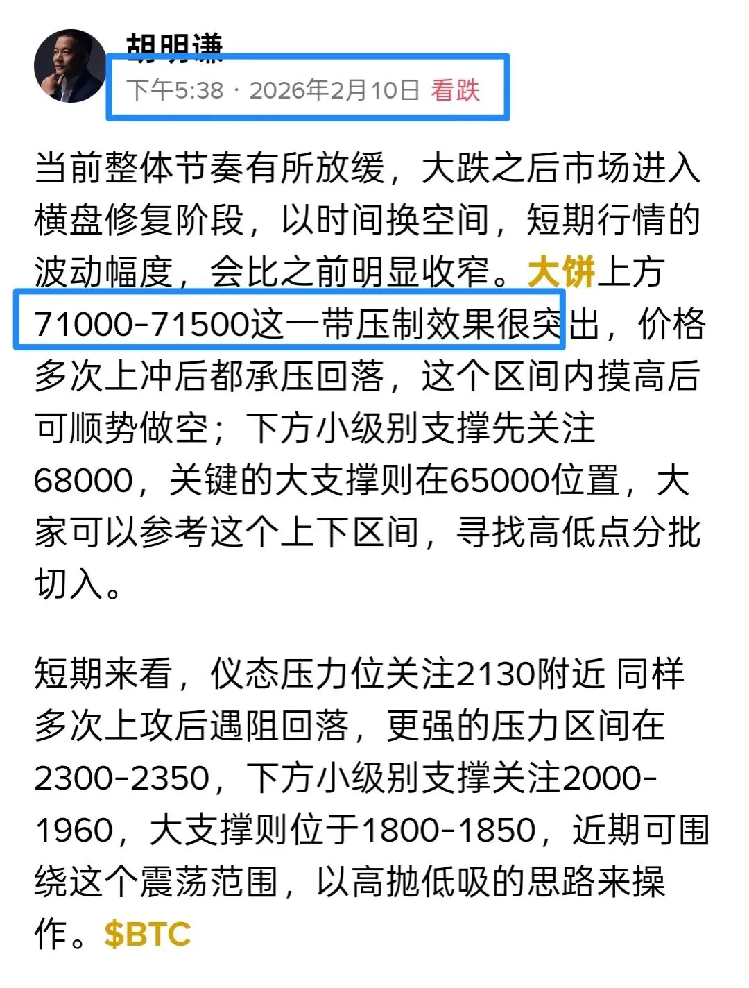 今天行情走得颇为顺畅,空头如期发力,接下来就看晚间非农数据,能否进一步助推行情下行。今天整体的运行节奏,和我们此前预判的基本吻合,近期老胡也是一直提示大家以做空为主,此前70300附近进场的空单也是一直浮盈持有当中,66000这一关键位置一旦失守,后续想要走出强势反弹,难度会明显加大;若是有效打开下跌通道,后市大概率会顺势下探。