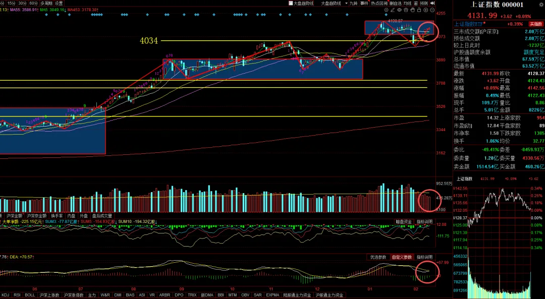 今天全天市场波动率还是很低,两市成交额继续缩量,昨天提到春节前各路资金无心恋战,基本确定最后二个交易日维持这种窄幅震荡的概率较大,目前根据市场的情绪和股价处于中枢上升阶段来看(如下图),基本确定这里没有高低点,没有系统性风险,震荡为主,持股过节。 大多数股民都想要过年红包行情,这种想法无可厚非,但资本市场是残酷的,在这个零和博弈的市场里,我们不应该因为过节而改变对股市的看法,股市的逻辑应该是一致性的,延续性的。昨天我说持股待涨的概率大,并不是因为看好节后将上涨,而是我判断节前的三天,市场波动率小,不足以改变现有的交易策略。我们现在就是持股待涨,延续了这个操作而已。股市真正的难点在于我们自身,想的太多,小聪明太多。