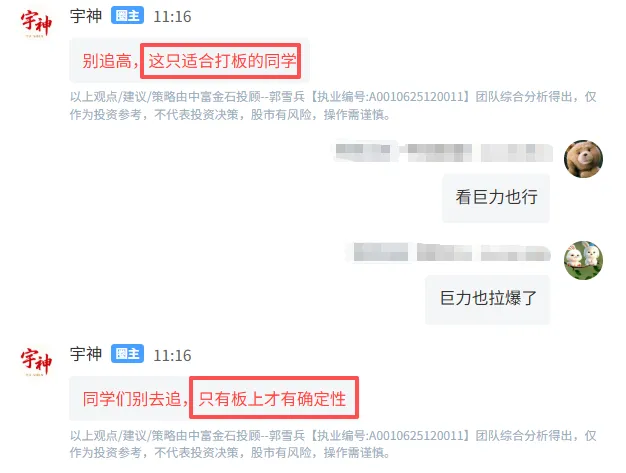 盘中回收消息刺激,巨力同学冲高,宇林军的同学想去追高,宇神提示只能板上确认,