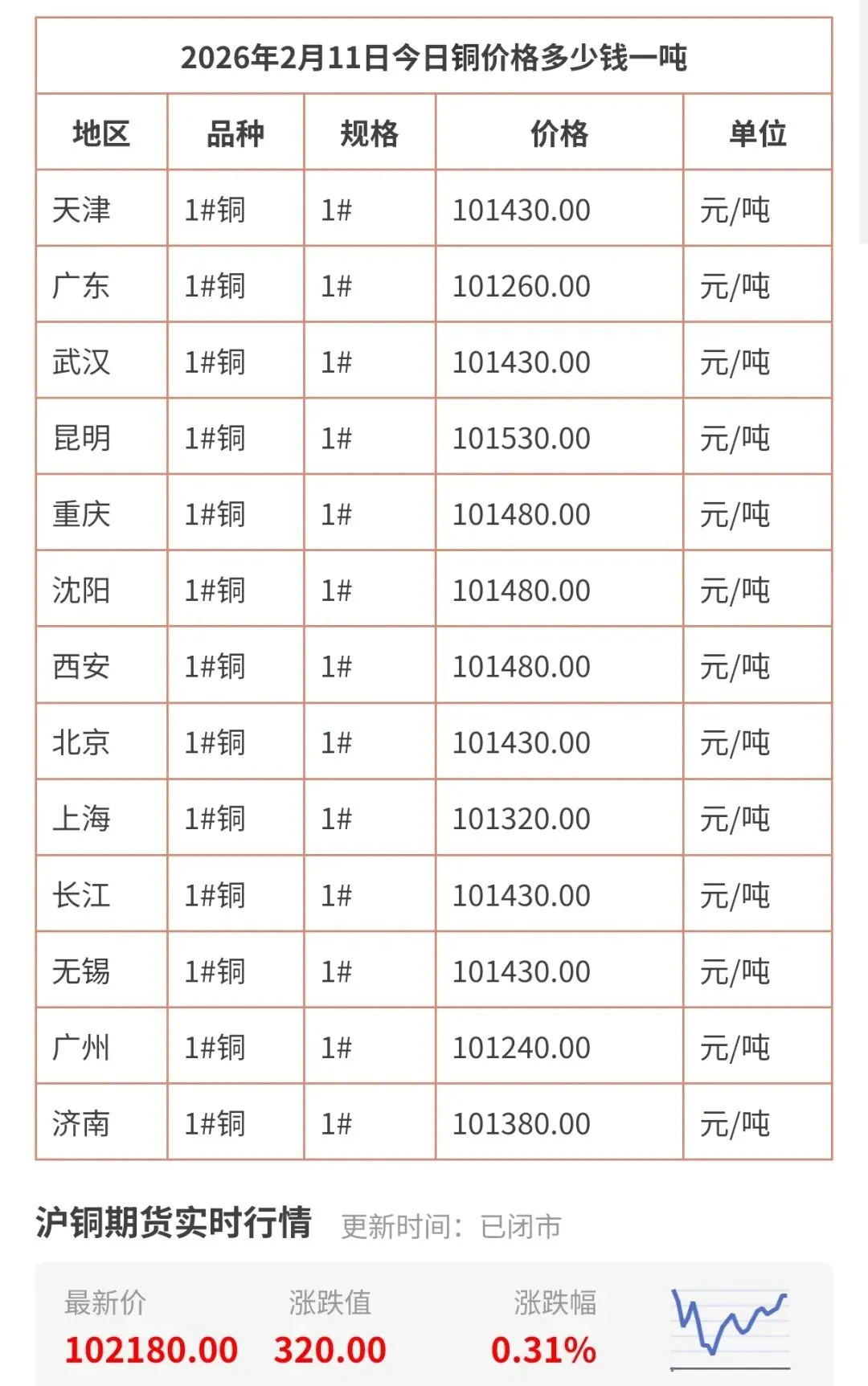 2月11日更新,今天铜价实时查询!最新今日铜价格多少钱一吨,包括广东、武汉、昆明、西安、无锡、天津等地区现货铜价格