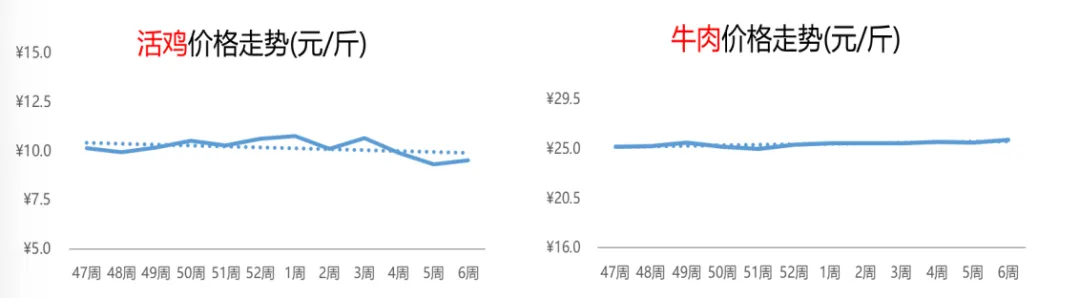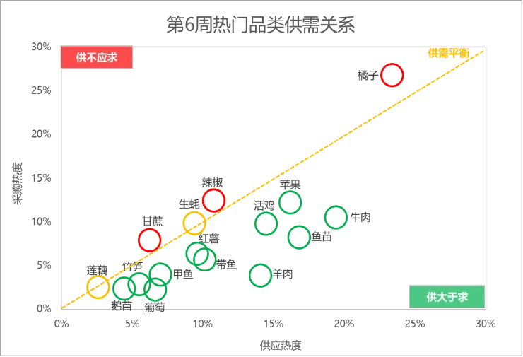 市场热门搜索品类的热度增幅方面,第6周,葡萄增长潜力十足,搜索热度较前一周大涨59%,生蚝和鹅苗依次随后,搜索热度环比增幅分别为31%和30%。分大类来看,畜禽肉蛋方面,鹅苗领跑其他品类,羊肉位列其后;水产方面,生蚝晋升至第1名,其次是甲鱼;蔬菜方面,竹笋和莲藕热度增幅相差不大,分居首席和次席;水果方面,葡萄市场表现尤为亮眼,甘蔗次之。分析惠农网平台热门品类的供需关系:橘子、辣椒和甘蔗的供应相对偏紧;生蚝和莲藕的供需相对均衡;鹅苗、竹笋、甲鱼、带鱼和羊肉等11个品类的供应相对充足。4.1 禽畜肉蛋:活鸡价格出现回暖,牛肉行情小幅上行