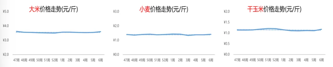 2月上旬,活鸡行情出现回暖迹象,价格步入上行通道。第6周,活鸡的价格为9.5元/斤,环比、同比分别上涨2%和10%。近期,牛肉的行情大体以稳为主,并伴有小幅上涨的态势。本周,牛肉的价格为25.8元/斤,环比和同比涨幅分别为1%和12%。经过前2周的拉升后,本周生蚝的价格有所回调,周均价为5.5元/斤,环比、同比纷纷下跌,跌幅分别为3%和19%。整体来看,甲鱼的行情价格走势较为波动。第6周,甲鱼的周均价为每斤37.1元,较上周和去年同期分别下跌1%和3%。本周,辣椒的行情延续上周的下跌态势,但环比跌幅有所收窄,周均价为3.0元/斤,较上周下跌1%,但较去年同期上涨63%。当前,竹笋的市场热度上涨,价格随之上调。第6周,竹笋的价格为9.3元/斤,与上周相比,上涨4%;而与去年同期相比,上涨3%。橘子价格在连续上涨11周后,行情出现降温。第6周,橘子的价格环比下跌1%至2.0元/斤,同比下跌3%。近段时间,苹果的市场行情保持平稳运行。本周,苹果的周均价为4.5元/斤,环比下跌1%,但同比上涨14%。4.5 粮食:大米、小麦和干玉米行情齐上涨