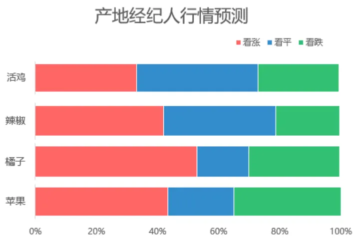 据产地经纪人对热门品类后市行情预测:活鸡看稳的比重为40%,略高于看涨和看跌;辣椒后市行情大概率稳中有涨,看涨和看稳的合计比重超过7成;橘子和苹果方面,看涨和看跌各占一定的比重,但看涨的比重稍高一些。湖南惠农科技有限公司