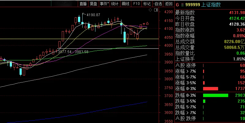 咱们直接切入重点。今天 A 股市场呈现出分化态势,上证指数走出冲高回落的小阳线,创业板指数同样冲高回落,但收的是阴线。这里的关键并非 K 线形态,而是成交量。早在一周前我就跟大家讲过,整个市场接下来会进入一个短期窄幅震荡阶段,也就是盘整。这是因为市场存量资金会逐步萎缩,而最近三天的行情也印证了这一点。周一市场上涨,周二和周三就是典型的震荡 K 线,整个盘面既没有大幅上涨,也没有大幅下跌,始终维持在窄幅区间波动,并且震荡幅度越来越小。