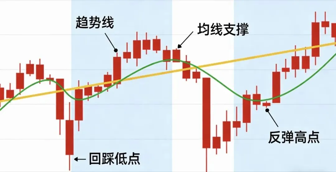 2. 价格回踩趋势线/均线/前高前低。