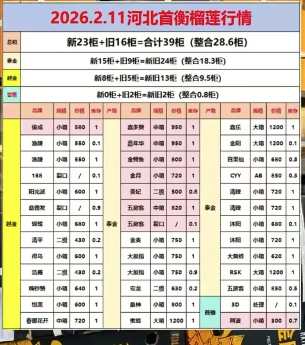 泰国金枕今天新货A6/19-20KG的极个别牌子走1150左右,好货新货走在1050-1080,其余18.5-20KG中上货走980-1050,B6/18.5-20KG中上好货走850-900,一般的780-830