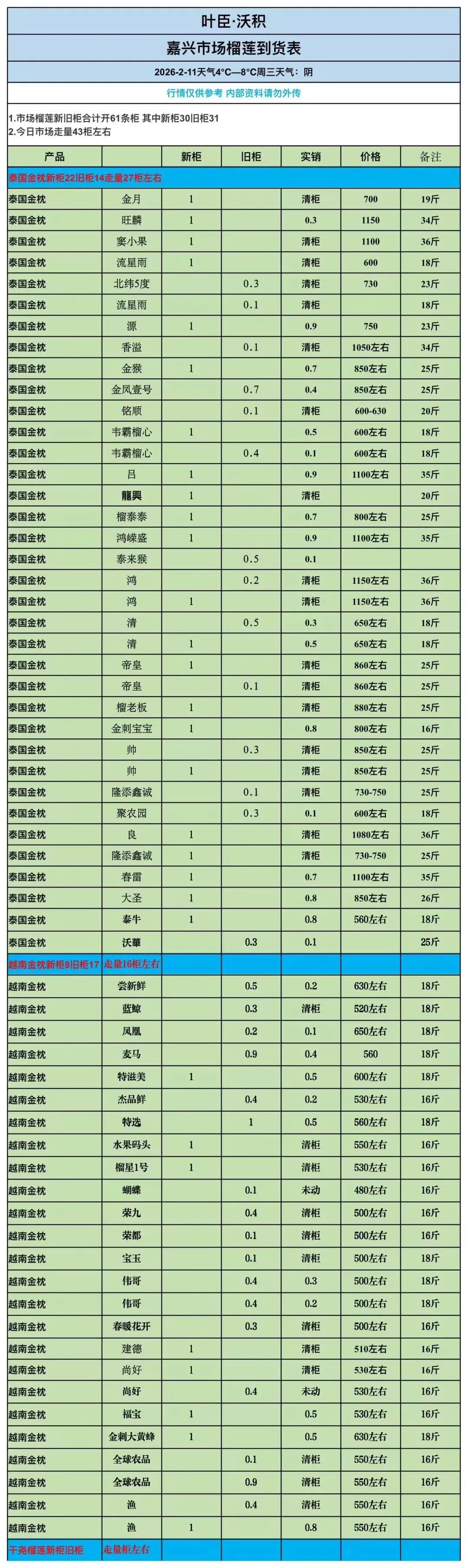 越南金枕新货少,个别好货走600上,A3/9kg基本走440-480,B3/9kg走在350-370
