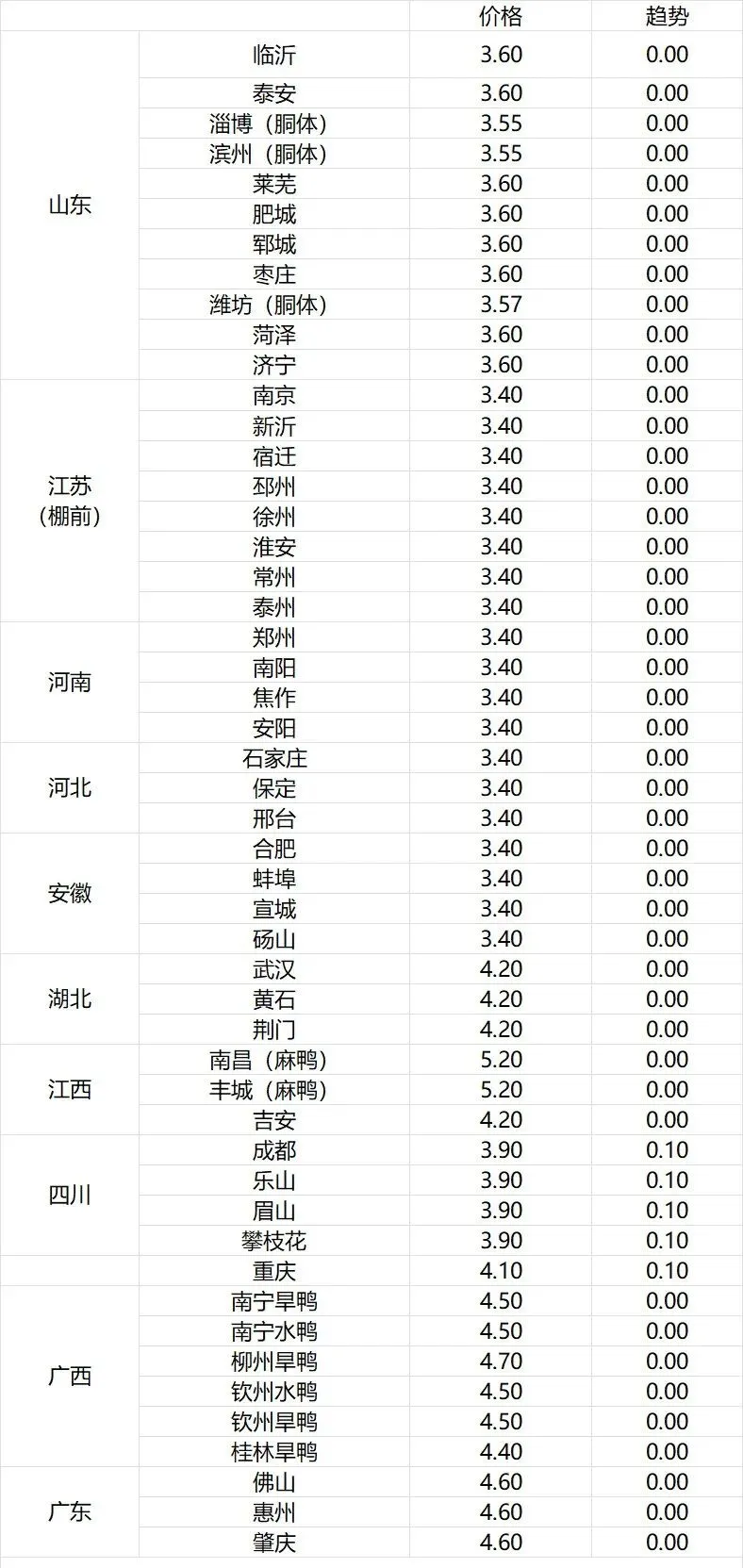 微评:鸭苗报价稳定。(注:南方只报当天价格)临节交投情绪平淡,计划一般。根据产品、养殖成本及鸭苗现状分析,预计近期鸭苗价格呈稳中微调趋势。种蛋报价稳定。温馨提示:该价格为主流厂家报价,实际销售价格以成交价格为准,价格仅供参考。