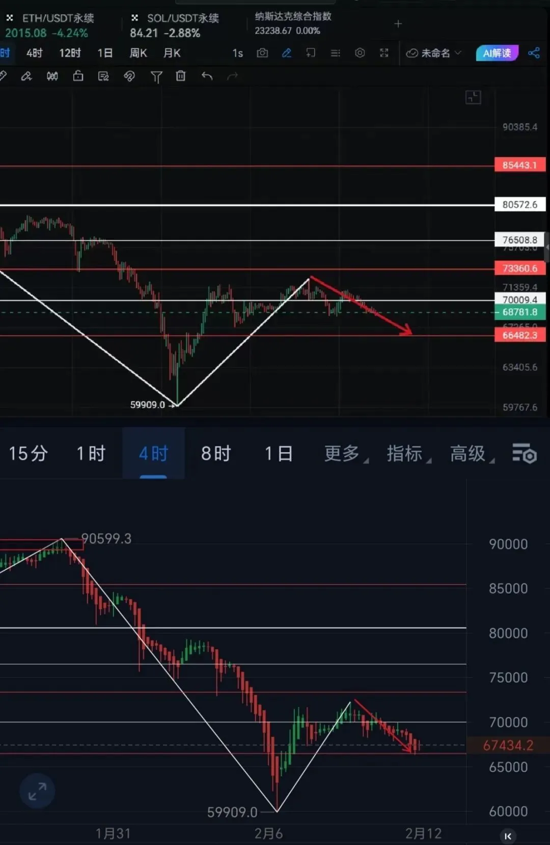 今天非农,消息面前后要谨慎,要先观察,所以更新的比较晚。其实这种行情没啥更新的必要。下跌符合预期,下一步就是震荡再探一笔了。依旧以空处理为佳。