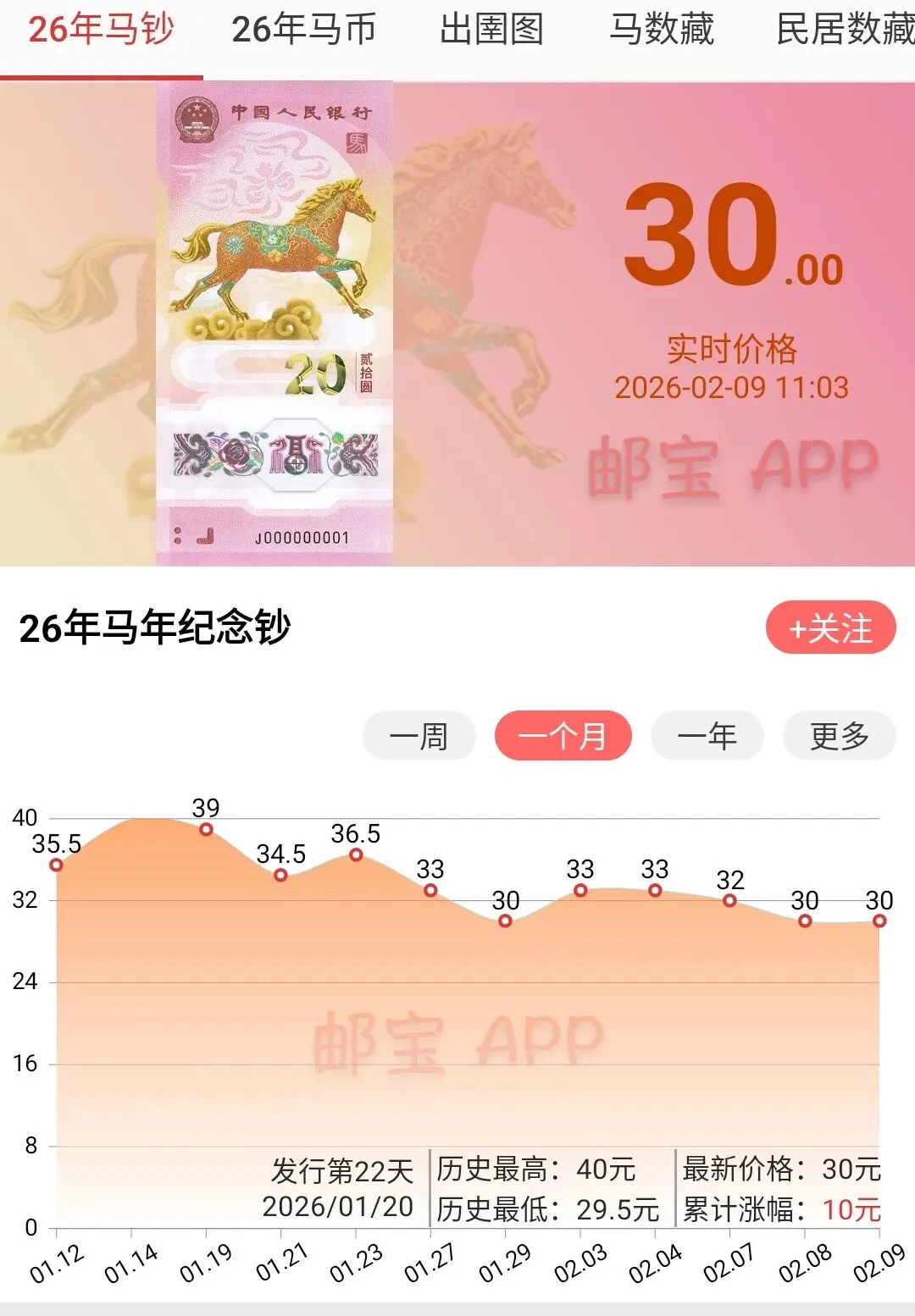 2026年马年纪念钞在呃1月份的时候也跌破过30元,现在距离跌破30元,虽然说还有一点点距离。但是跌起来也是挺快,一不小心也会跌破30大关也有很大的可能性。