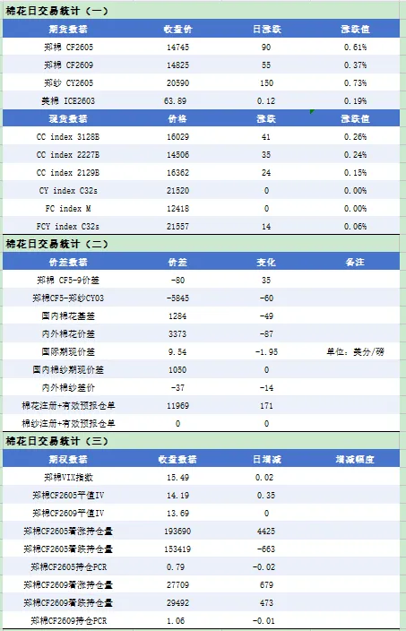 1. 期权信号:CF2605合约持仓PCR = 0.79(<1),认购期权略占优势,市场对近月合约的看涨情绪占主导。CF2609合约持仓PCR =1.06(<1),表明市场参与者为了防范下行风险而购买的看跌期权数量。