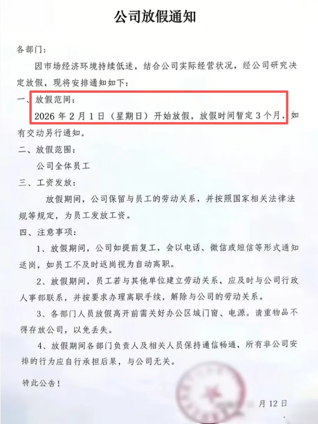 2026年2月1日开始放假3个月,截止到4月30日,工资按照国家规定发放,基本工资2000左右,这也是最后的底线了。