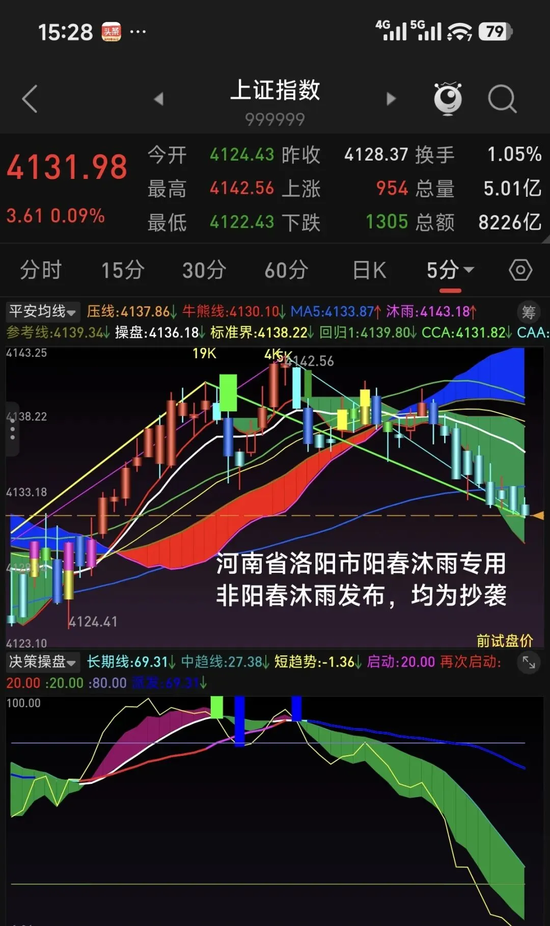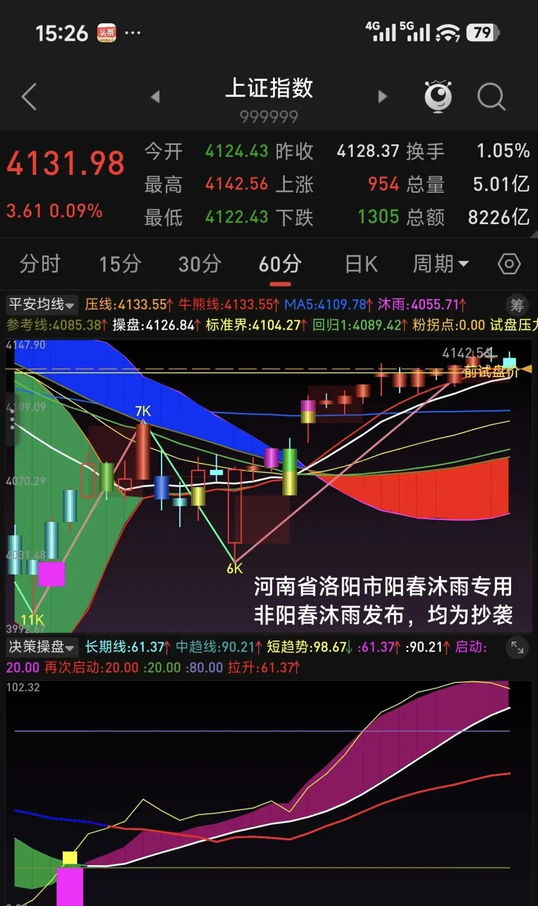 从60分钟级别看,均线保持多头趋势,红色支撑带对指数形成托举。决策指标同为多头趋势,中短期线在长期线上方运行,而且长期线处在中位附近,说明60分钟级别上升趋势没有走完。但由于决策指标中短期线处在高位,指数可能会有短线回落。目前指数已经跌破了操盘线,仍有继续下行的可能。支撑位在4105~4085之间。