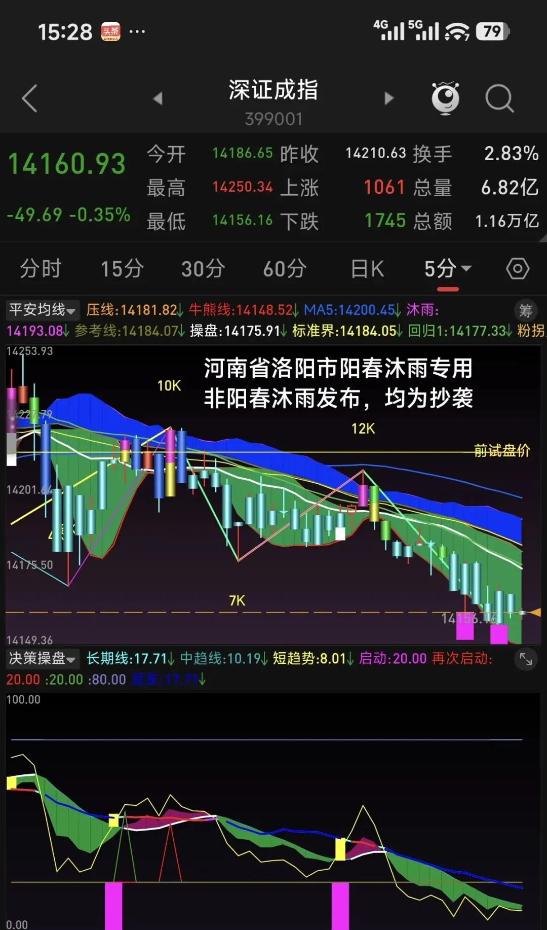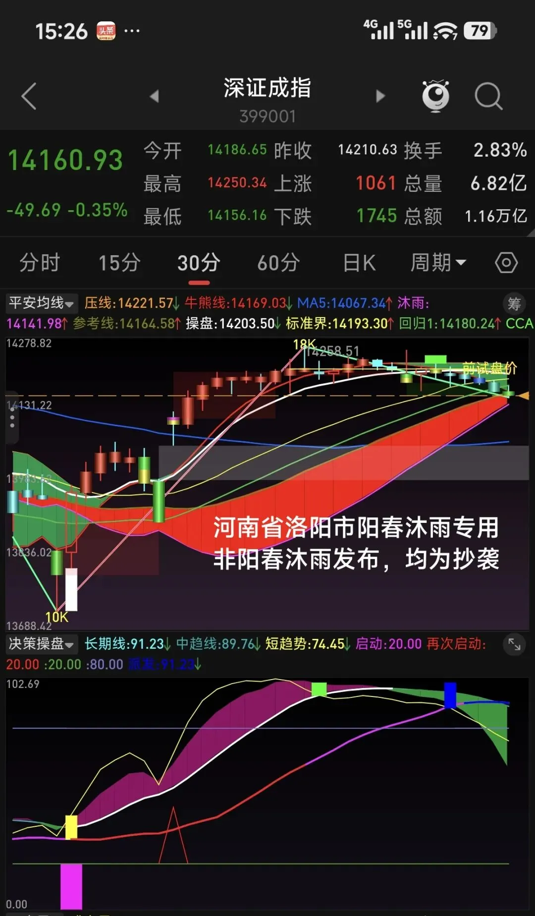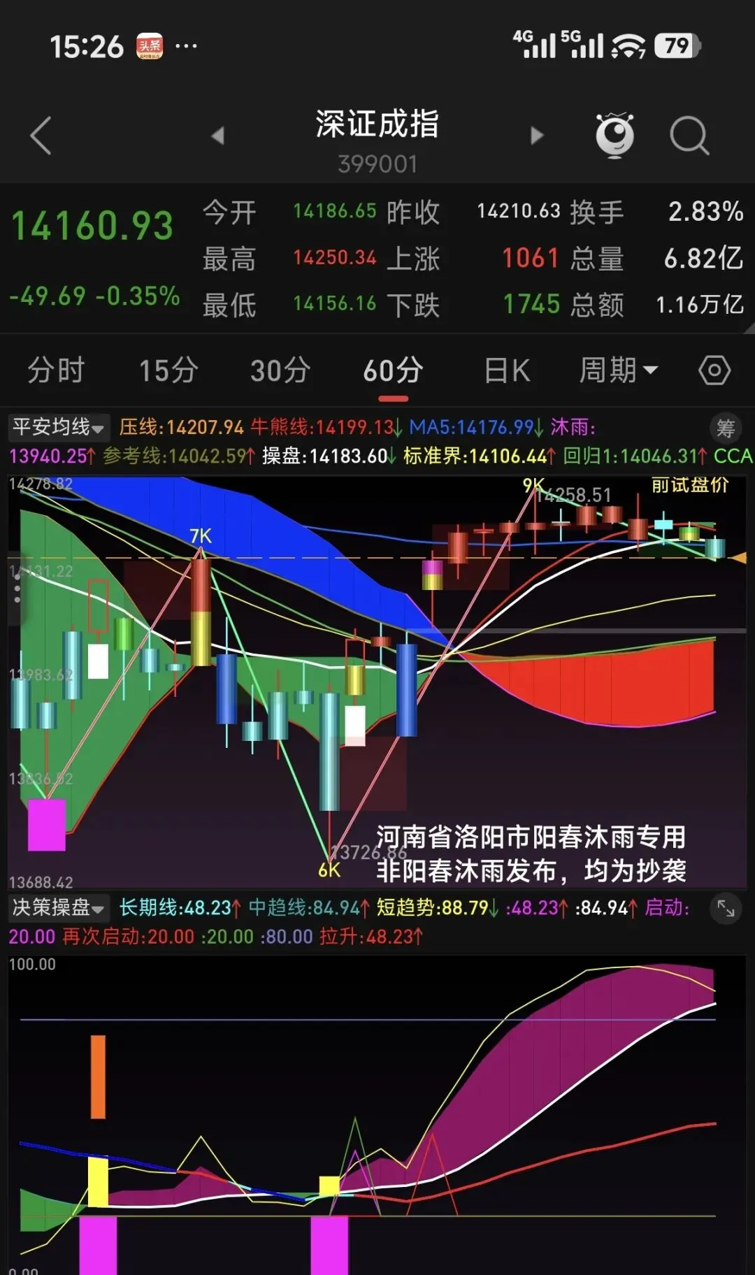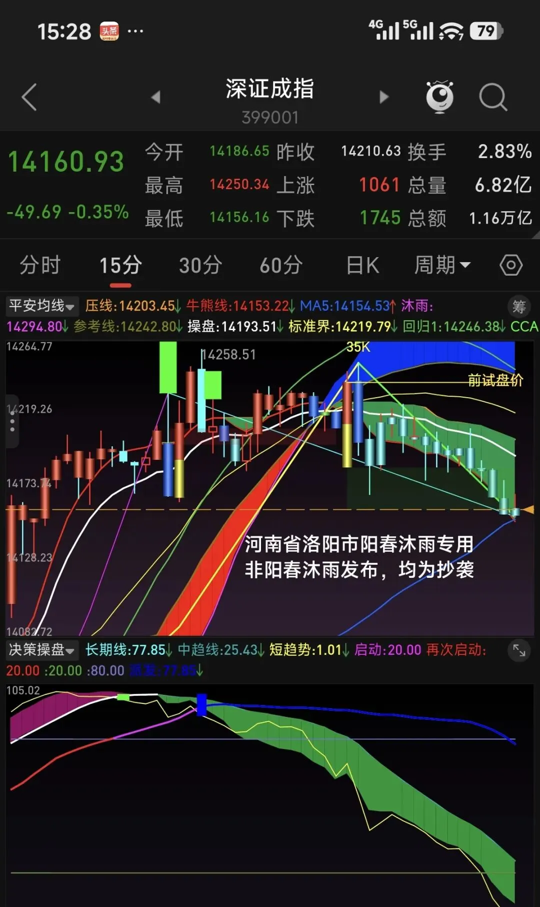 从15分钟级别看,上证指数昨天走了一笔上涨和一笔回落,但均线系统一直处在空头趋势当中,蓝色压力带一直对指数形成高压态势,尾盘的一笔回落仅差0.09%没有收阴。决策指标与指数形成背离没有创新高。深创科指数早盘低开冲高后,持续回落,与昨日早评预判的一致。目前处在15分钟级别下行中。从决策指标中短期线和长期线所处的位置判断。深创科指数可能会出现低开~冲高~再回落的走势。