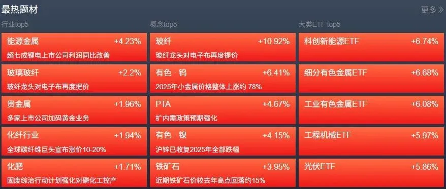 热点再次轮动。玻纤概念股集体大涨,有色金属板块走强,化工股反复活跃。下跌方面,影视概念股调整,AI应用、旅游、CPO等板块跌幅居前。