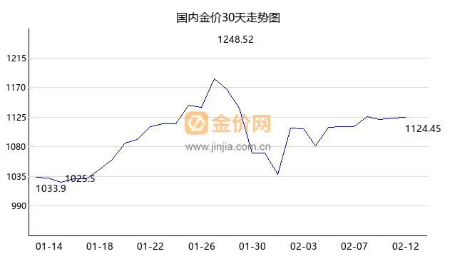 今日国内金价平稳,现价1123.97 元/克,平稳0.00%,今日开盘价1135.00,最高价1136.50,最低价1115.35。
