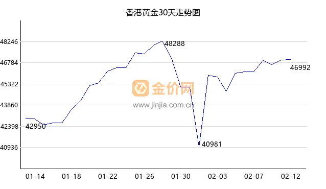 今日香港黄金下跌,现价47017 港币/两,今日开盘价47207,最高价47339,最低价46820。
