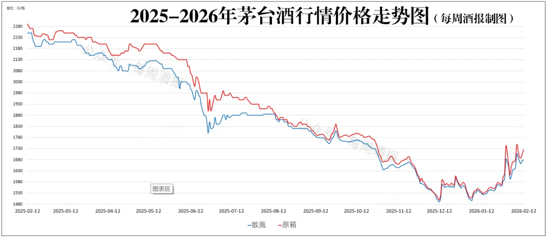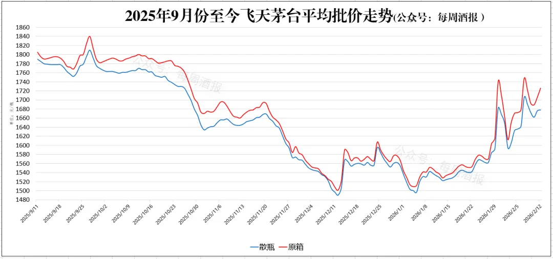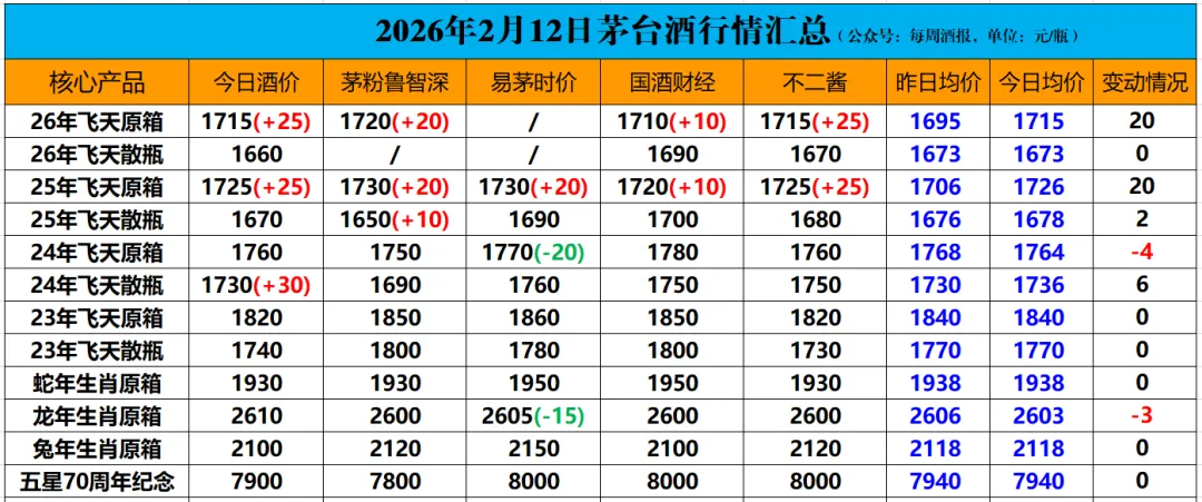 飞天茅台:2026年原箱均价上涨20元,报收1715元;散瓶均价保持在至1673元。2025年原箱上涨20元,报收1726元;散瓶上涨2元,报收1678元。2024年原箱下跌4元至1764元,散瓶上涨6元至1736元。