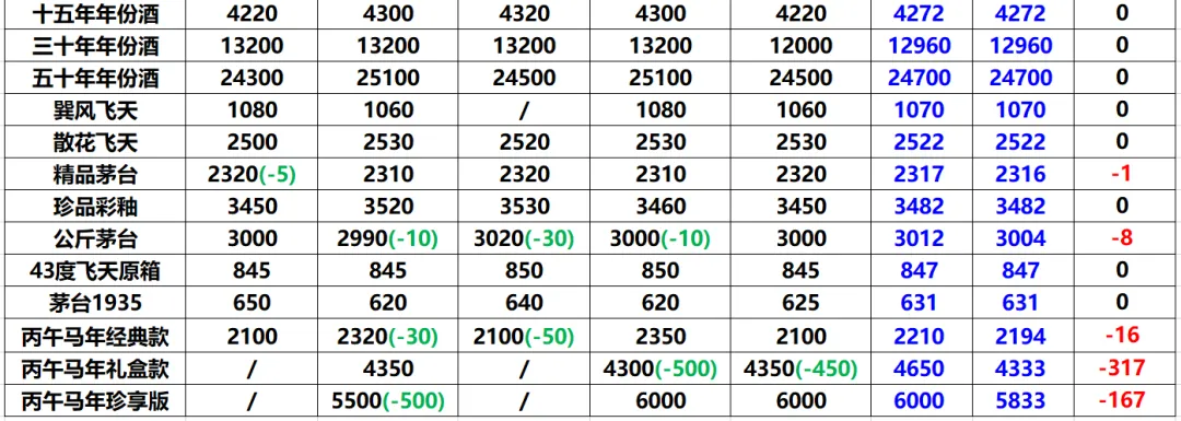 年份茅台:十五年年份维持在4272元;三十年份茅台维持在12960元;五十年份酒保持24700元。