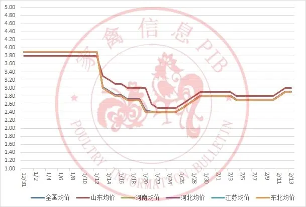 2025年12月31日-2026年2月13日主流地区白羽鸡鸡苗均价走势图