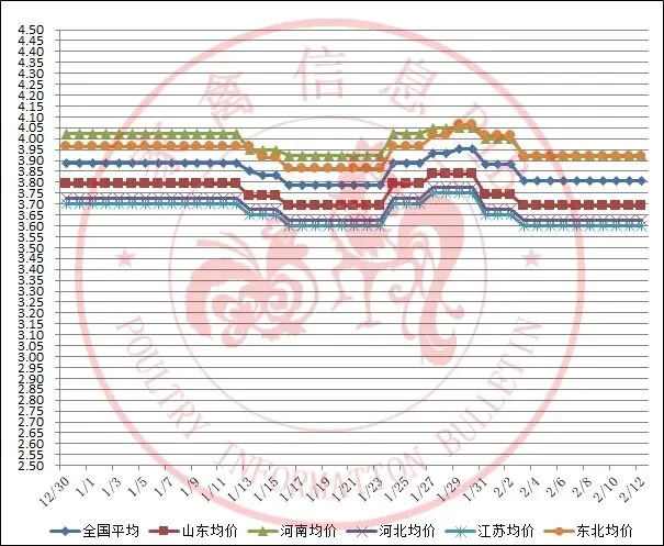 2025年12月30日-2026年2月12日主流地区白羽鸡毛鸡均价走势图