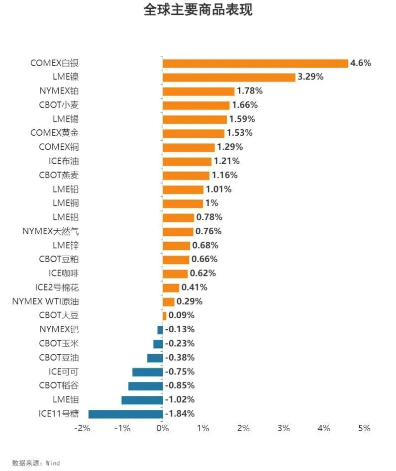 全球主要商品价格多数上涨;国际油价小幅上涨,ICE布油涨1.21%;国际贵金属期货表现强势,COMEX白银涨4.60%,COMEX黄金涨1.53%;伦敦基本金属集体收涨,LME镍涨3.29%,LME锡涨1.59%,LME铅涨1.01%,LME铜涨1.00%,LME铝涨0.78%,LME锌涨0.68%。
