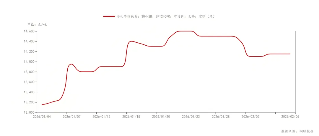 短期(2月下旬至3月初):复工初期库存累积,价格震荡主稳。304冷轧现货卷板价格区间预计13800-14300元/吨,若需求启动延迟,可能下探至13600元/吨支撑位。