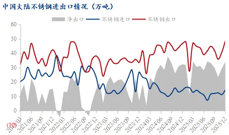 出口数据支撑减弱,2025年12月中国不锈钢净出口量约34万吨,同比增加1.66万吨,增幅5.1%,但累计出口同比增速放缓至0.3%,暗示海外需求动能减弱。