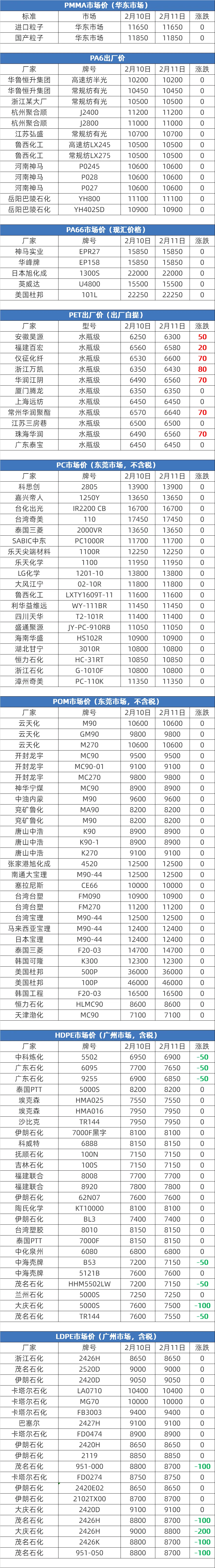 2026年2月11日大宗商品价格涨跌榜中橡塑板块环比上升的商品共3种,涨幅前3的商品分别为天然橡胶(1.34%)、PVC(0.39%)、顺丁橡胶(0.38%)。