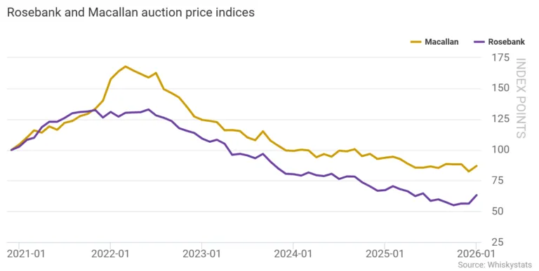 2026年1月,拍卖市场表现最突出的品牌为罗斯班克。Whiskystats数据显示,纳入统计的58款罗斯班克酒款,1月整体市场价值上涨12.3%,创下该品牌自2014年以来的最大单月涨幅。