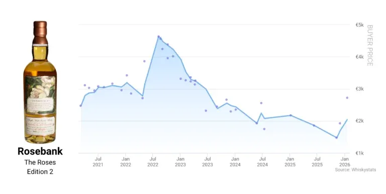 这一上涨部分抵消了罗斯班克在2025年累计15.7%的跌幅,也使其重新回到 Whiskystats拍卖价格指数前十。具体酒款层面,罗斯班克第二版在2025年11月一度跌至1500欧元左右,但在1月拍卖中成交价已回升至2700欧元(含买家费用);罗斯班克32年第三批次的成交价亦在1月出现跳涨,相比12月均价上涨超过2000欧元。
