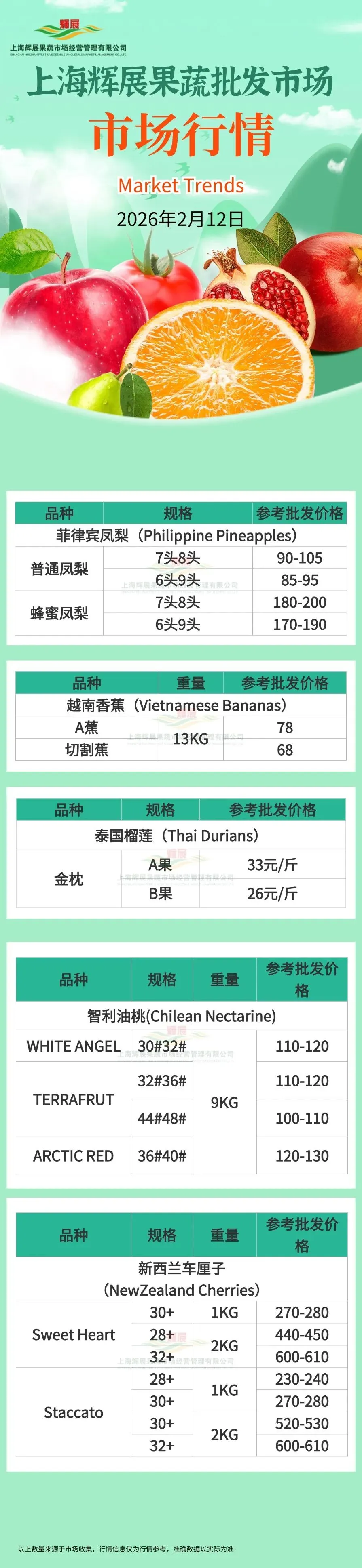 >2月12日上海辉展果蔬批发市场行情|新西兰车厘子、智利油桃、越南香蕉、泰国榴莲、菲律宾凤梨等
