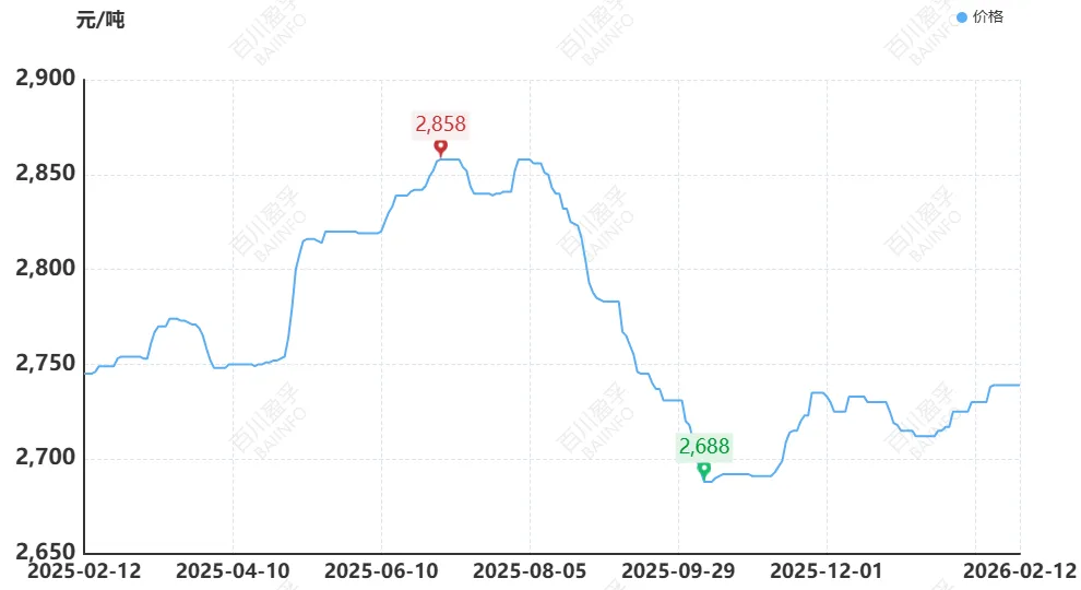 截止2月12日国内玉米淀粉市场均价为2739元/吨,较上周价格持平,较上月价格上涨1.00%,较上季度价格上涨1.59%,较年初价格上涨0.88%,较去年价格下跌0.22%。