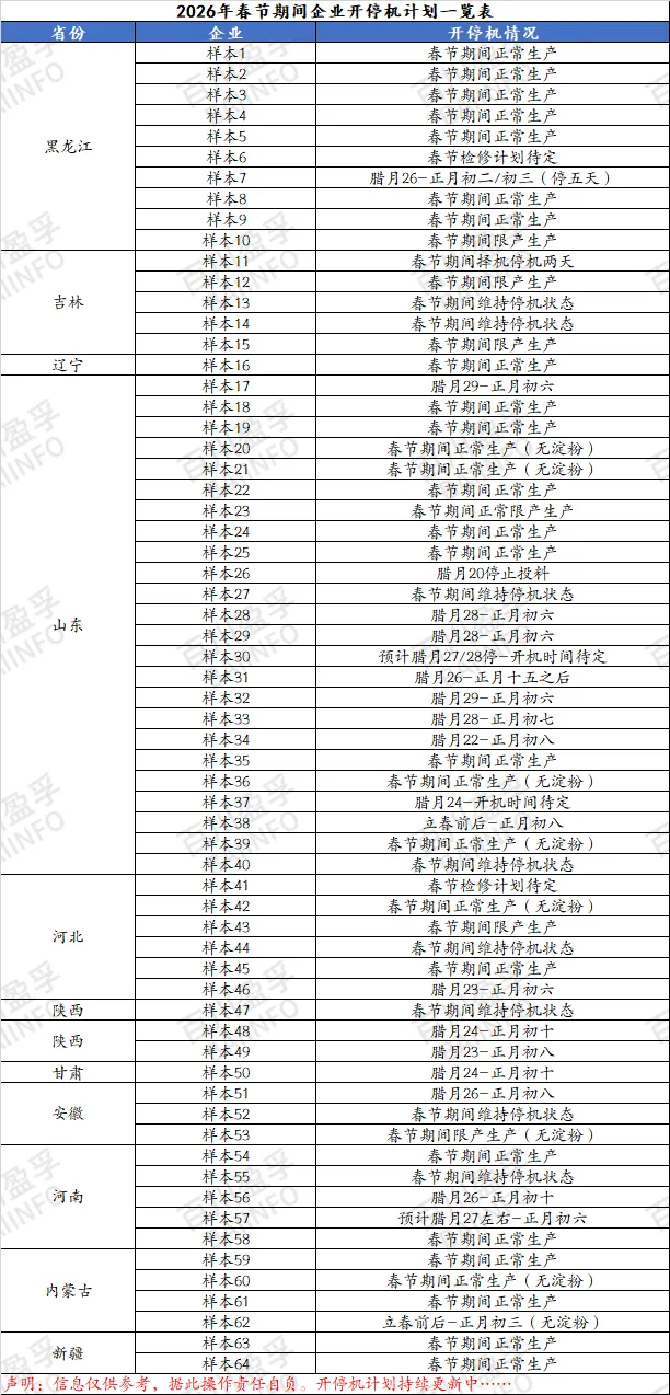 具体请看百川盈孚统计春节期间64家(新增一家山东淀粉企业)企业开停机情况进行的调查汇总,如下表: