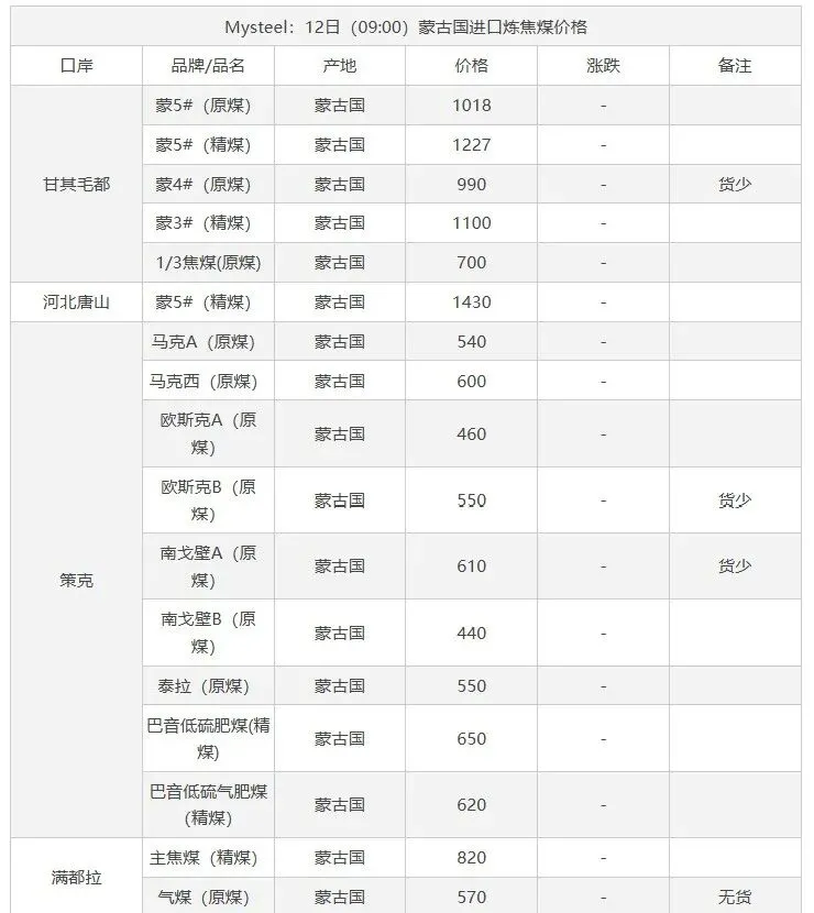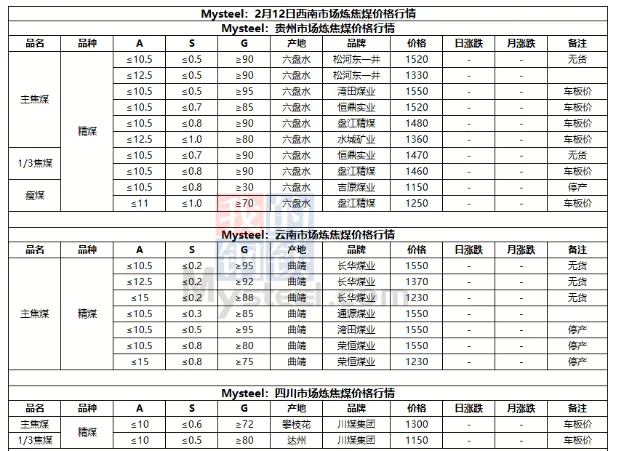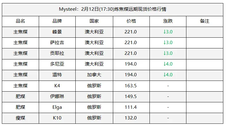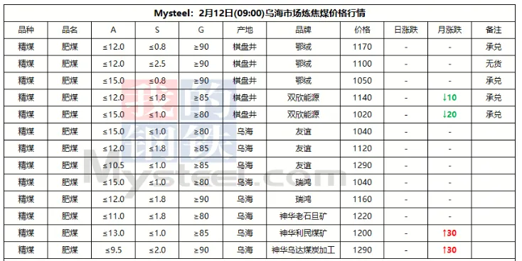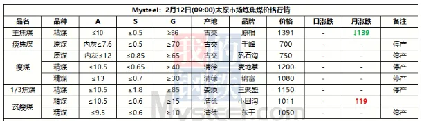 12日太原市场炼焦煤价格暂稳。春节临近,市场基本进入休市状态,焦企补库完成,物流逐步停滞,多数民营矿点放假停产,市场有价无市,部分矿点年前仍有零星竞拍,但因需求寥寥,流拍率居高不下。现古交低硫主焦煤出厂含税价1391元/吨;清徐瘦煤出厂含税价1200元/吨。