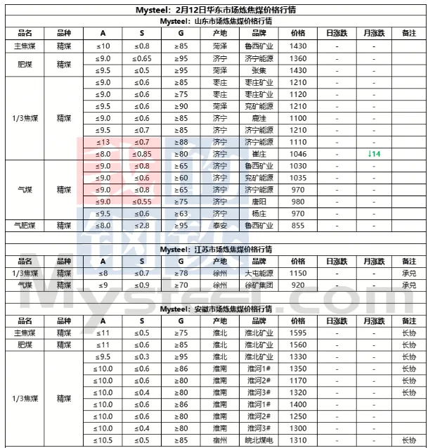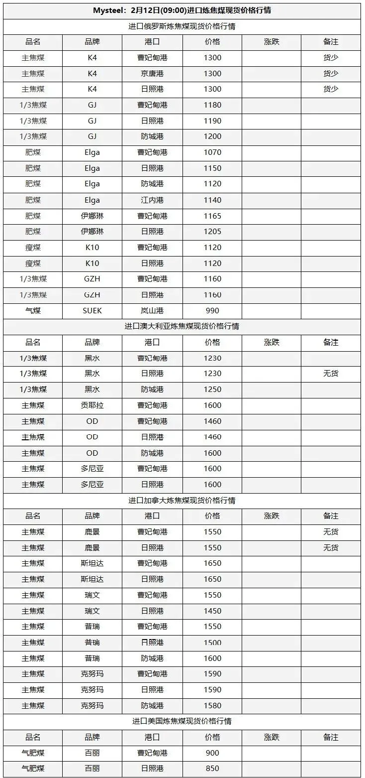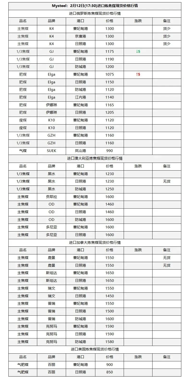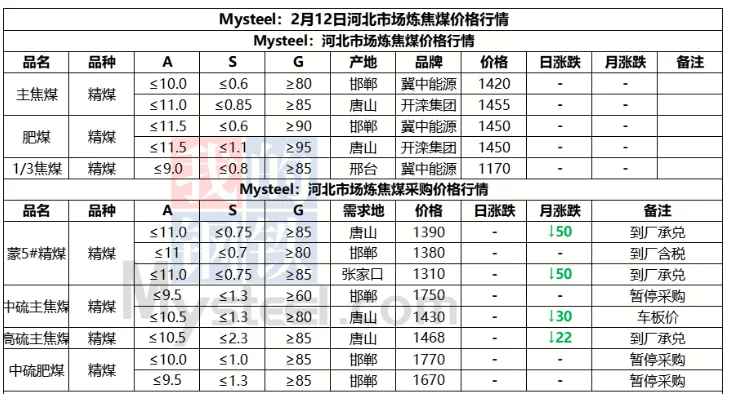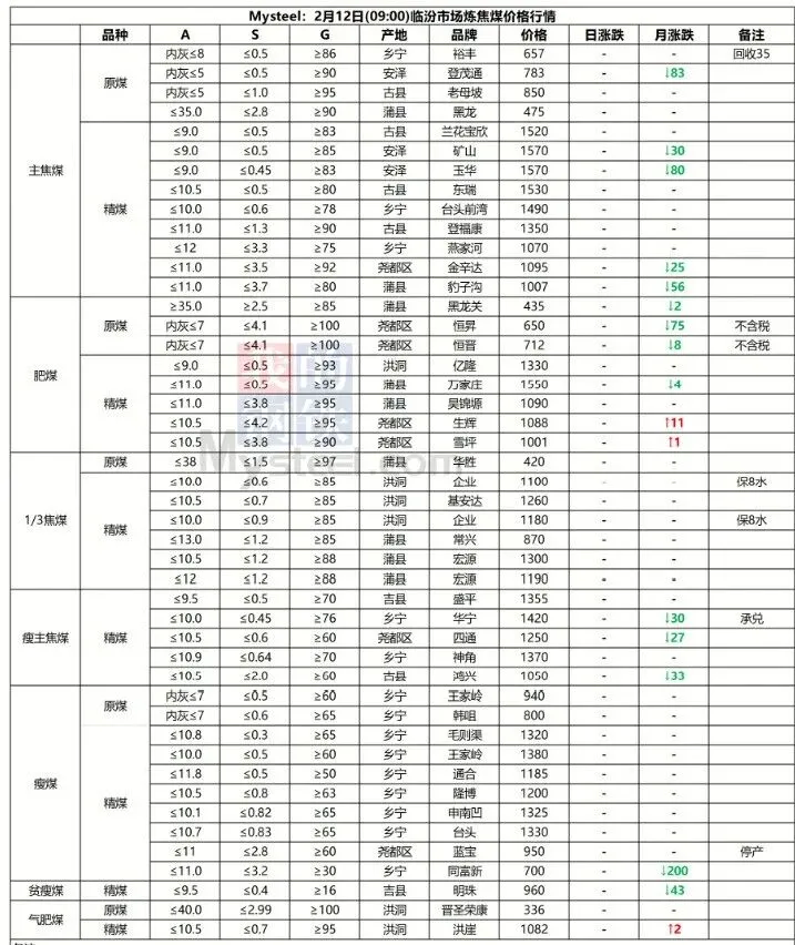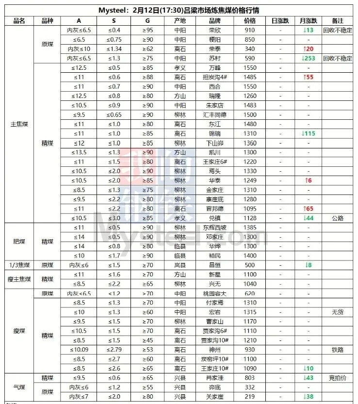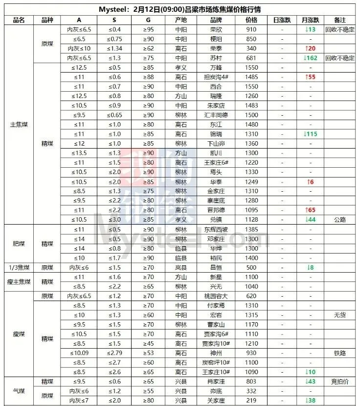 12日临汾市场炼焦煤价格偏弱运行。供应方面,本周开始区域内煤矿陆续进入春节放假周期,国营煤矿放假计划普遍为3-7天;现钢厂高炉开工相对高位,铁水产量同比高位,焦炭刚性需求支撑较好,后期需持续关注焦煤走势、钢材价格走势。综合来看,预计短期内临汾市场炼焦煤价格震荡偏弱运行。