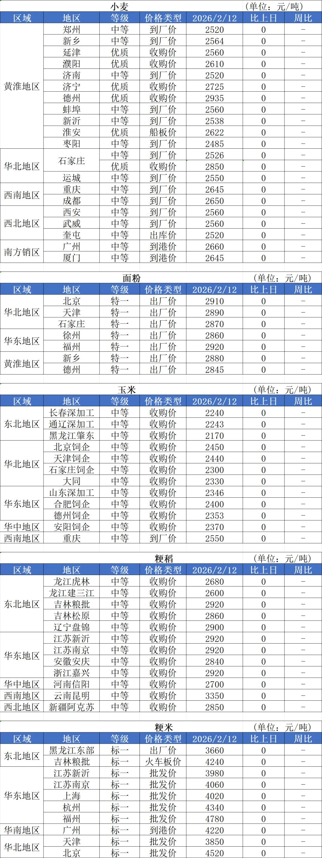 1、2026年中央一号文件中对我国畜牧业实施路径进行指明,对比2025年一号文件,2026年生猪政策从“做好生猪产能监测和调控,促进平稳发展”过渡为“强化生猪产能综合调控”,回顾2025年,国内生猪供应充裕,行业仍面临产能过剩。2、2月11日最低收购价小麦计划销售299694吨,实际成交211077吨,成交率70.43%。最高价2450元/吨,最低价2320元/吨,成交均价2346.5元/吨。3、上周,安徽早籼稻收购价128.3元/百斤,环比上涨0.26%;中籼稻收购价128.2元/百斤,环比持平;晚籼稻收购价129.4元/百斤,环比持平;晚粳稻收购价135.6元/百斤,环比上涨0.11%。4、美豆期价上涨,加之春节前资金避险情绪浓厚,部分空头资金受美豆强势刺激后慎于博弈后市走向,出现明显的弃仓离场行为,从而放大了国内豆粕期货价格上行弹性,豆粕现货市场跟涨,涨幅相对弱于盘面。5、虽然全球大豆、菜籽供应充裕,但我国菜籽和菜粕库存依旧偏低,不过反倾销调查将于3月落地,在此之前市场料将保持谨慎。节后菜粕供需结构逐渐向好,低位震荡局面预计将逐渐收尾,中长期行情已不悲观。