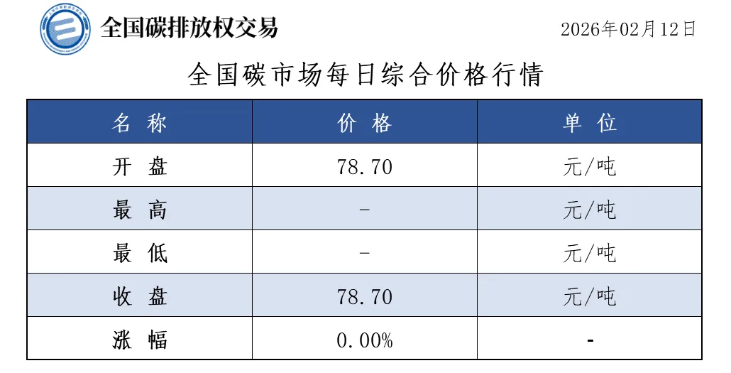 今日全国碳市场综合价格行情为: 开盘价78.70元/吨,收盘价78.70元/吨,收盘价与前一日持平。今日无挂牌协议交易;大宗协议交易成交量500,000吨,成交额32,370,000.00元;今日无单向竞价。今日全国碳排放配额总成交量500,000吨,总成交额32,370,000.00元。2026年1月1日至2月12日,全国碳市场碳排放配额成交量13,453,905吨,成交额986,094,251.80元。截至2026年2月12日,全国碳市场碳排放配额累计成交量878,320,425吨,累计成交额58,648,712,483.37元。
