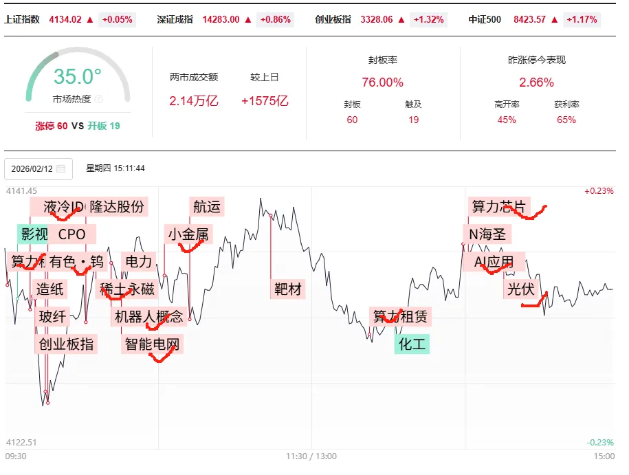 今天市场核心逻辑是政策+景气+业绩三重共振,算力赛道受益于央企算力投资加码、AI算力需求爆发,电网设备受益于电力基建与算力配套需求,两大方向均有明确的业绩与政策支撑;算力+电力算是新基建,也是新质生产力,是未来3~5年确定性比较高的“风口”。 3-5成仓位持仓,继续主线围绕科技成长+能源主线布局,今天市场主要的资金动向都是在这两个方向,年后可能会继续延续展开行情,所以操作上面不要偏离主线。 近十年跨年行情,领涨的基本是以科技为核心的成长题材(计算机、通信、半导体等)和部分有色周期,也是经济转型期市场风格的必然选择。大盘趋势结构还可以,下方20日线及4100点关口构成了双重强力支撑。