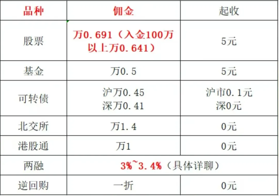 2. 股票佣金万0.8,ETF万0.5免5,可转债万0.5,北交所万2(资金大可协商)。