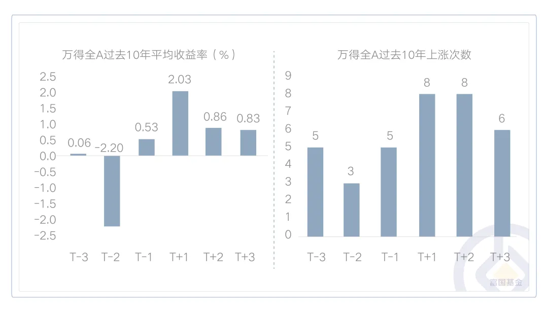 数据显示,在过去10年里,春节前的第二周一般是抛压较大的时期,全A平均收益率为-2.20%,10年中仅有3次上涨;而万得全A节后第一周的平均收益率为2.03%,10年中有8次实现上涨。