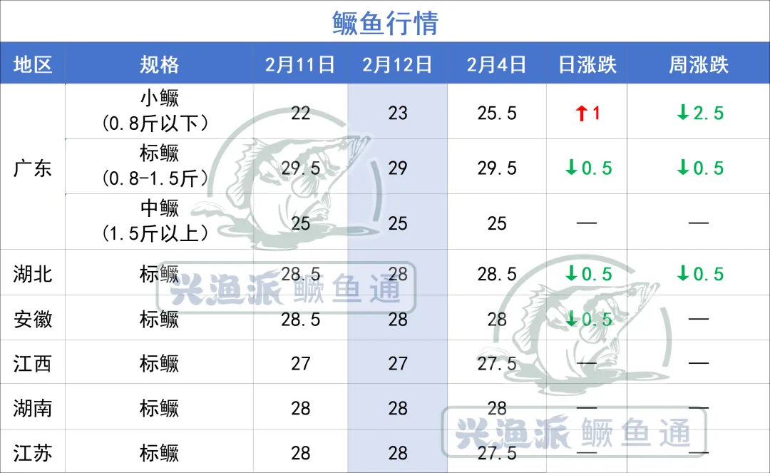 2月12日,广东小鳜价格涨1元/斤。广东标鳜跌0.5元/斤,湖北安徽标鳜跌0.5元/斤。