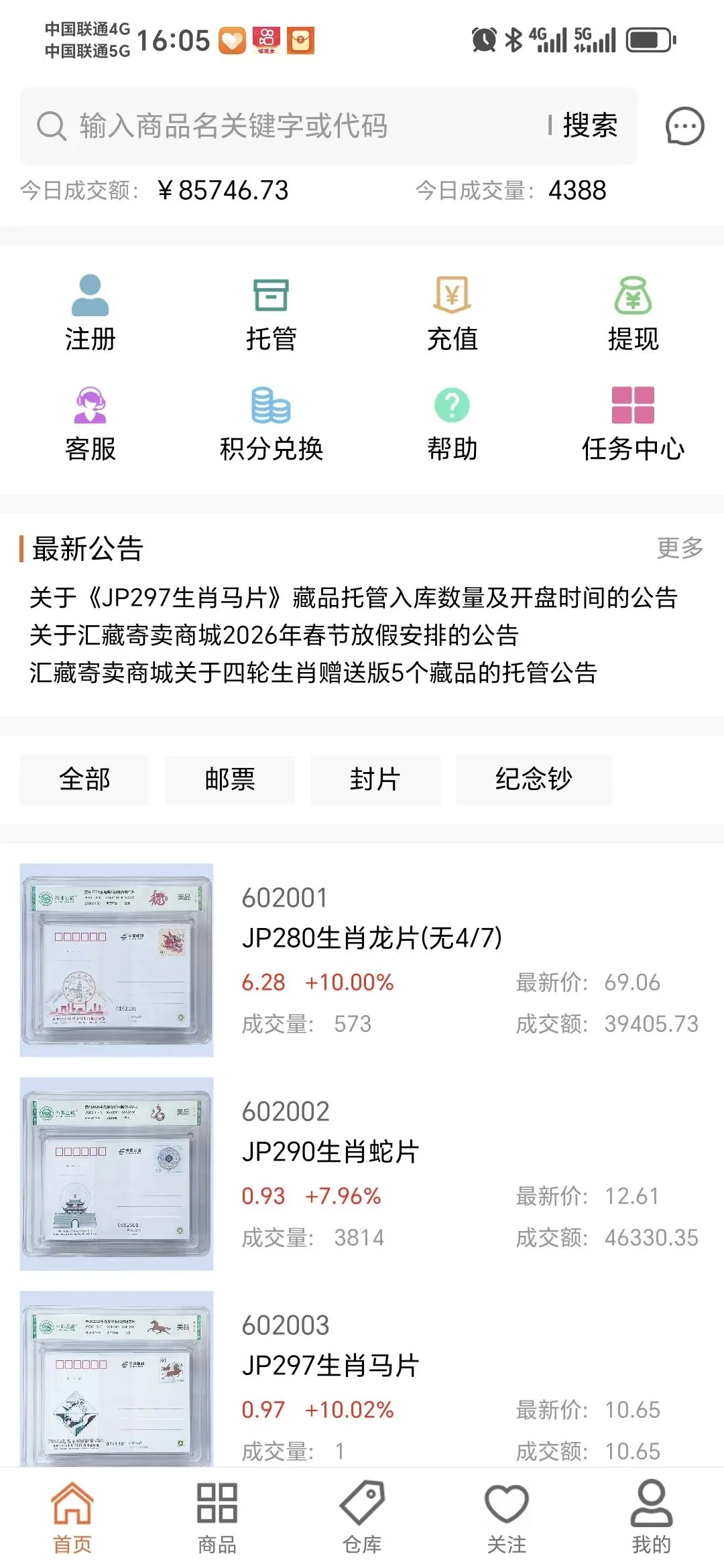 JP297生肖马片今天继续涨停,今天仅成交1枚收报10.65元,上盘量47200枚,藏品总值50.27万元,上架至今已上涨33.13%。