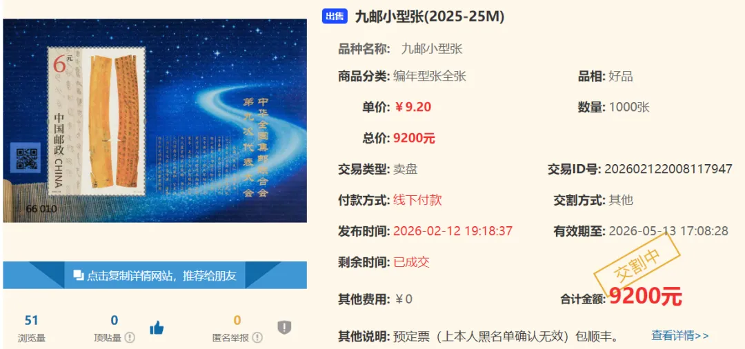 五牛图小型张(评级版)2刀8000元,挥扇仕女图小型张(互动金标)2刀7010元,货郎图小型张(互动金标)5刀5800元,二十大小型张(评级版)5盒1350元,高逸图小型张(评级版)1刀4450元,平遥古城小全张(百连评级版)4盒980元,书法篆书二小型张200张12.20元,九邮小型张3977张9.20元,关公小型张1250张12.10元,建国七十周年小型张500张6.50元,贺喜一年年有余大版(贺1)200版68元。