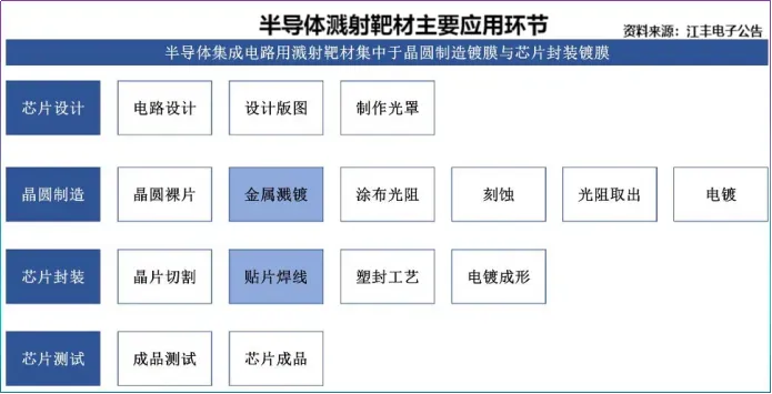 江丰电子主业聚焦于超高纯金属溅射靶材,主要应用于超大规模集成电路芯片、平板显示器的物理气相沉积(PVD)工艺,是制造存储芯片不可或缺的关键材料。